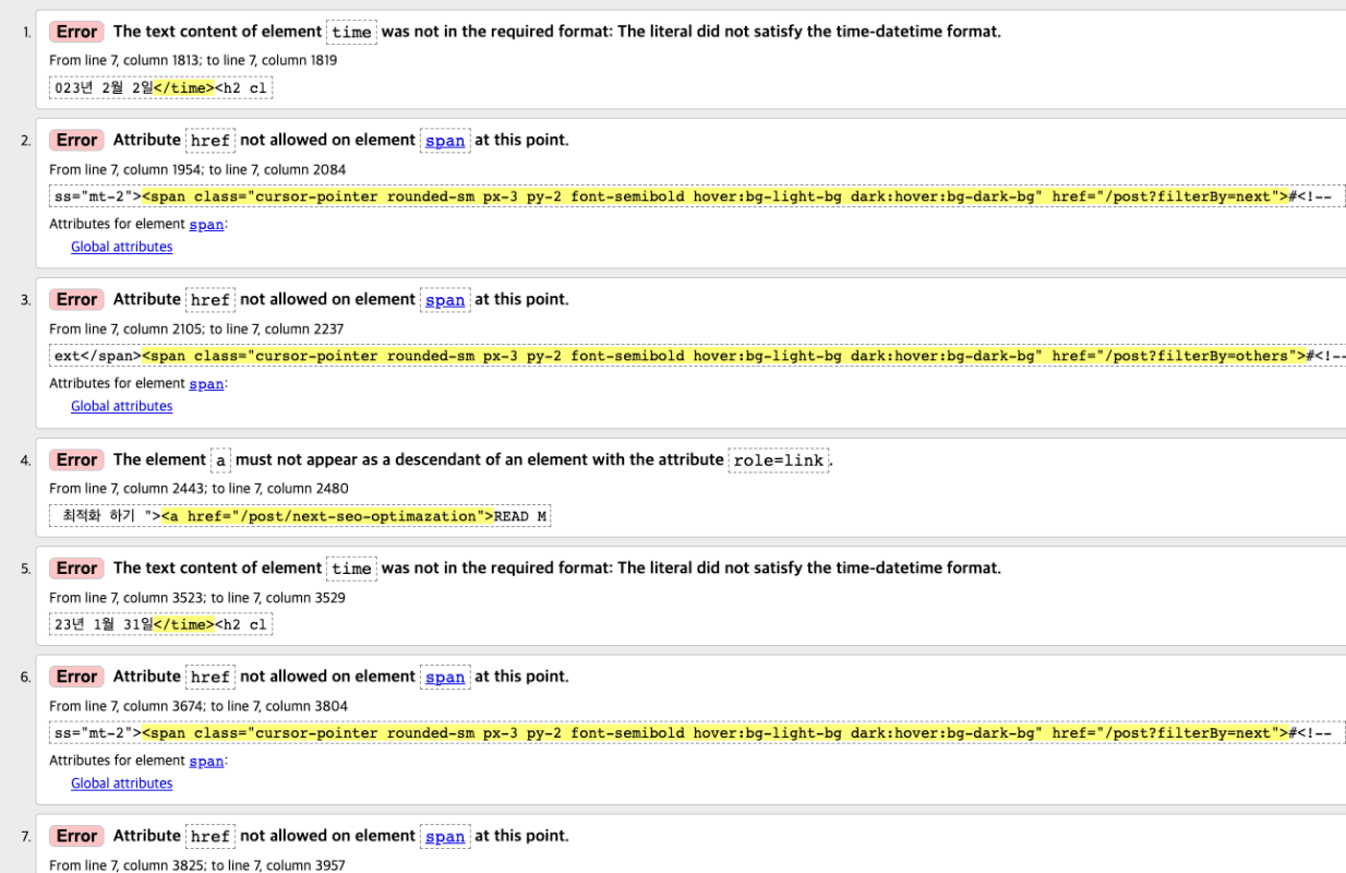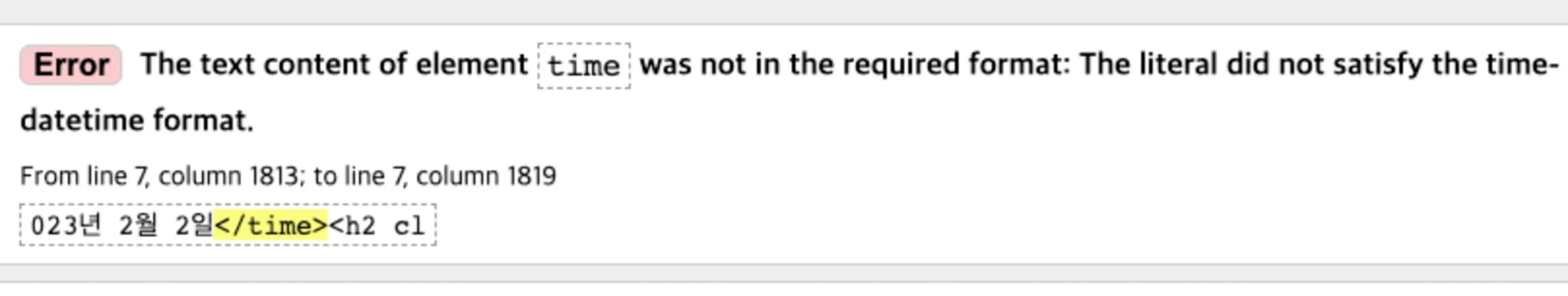 저는 time 태그를 통해 해당 아티클이 작성된 시간을 제공하고자 하였습니다. 사실 time 태그에 대해서 제대로 알아보지 않고 그냥 사용했었는데 해당 부분이 문제가 되었습니다.