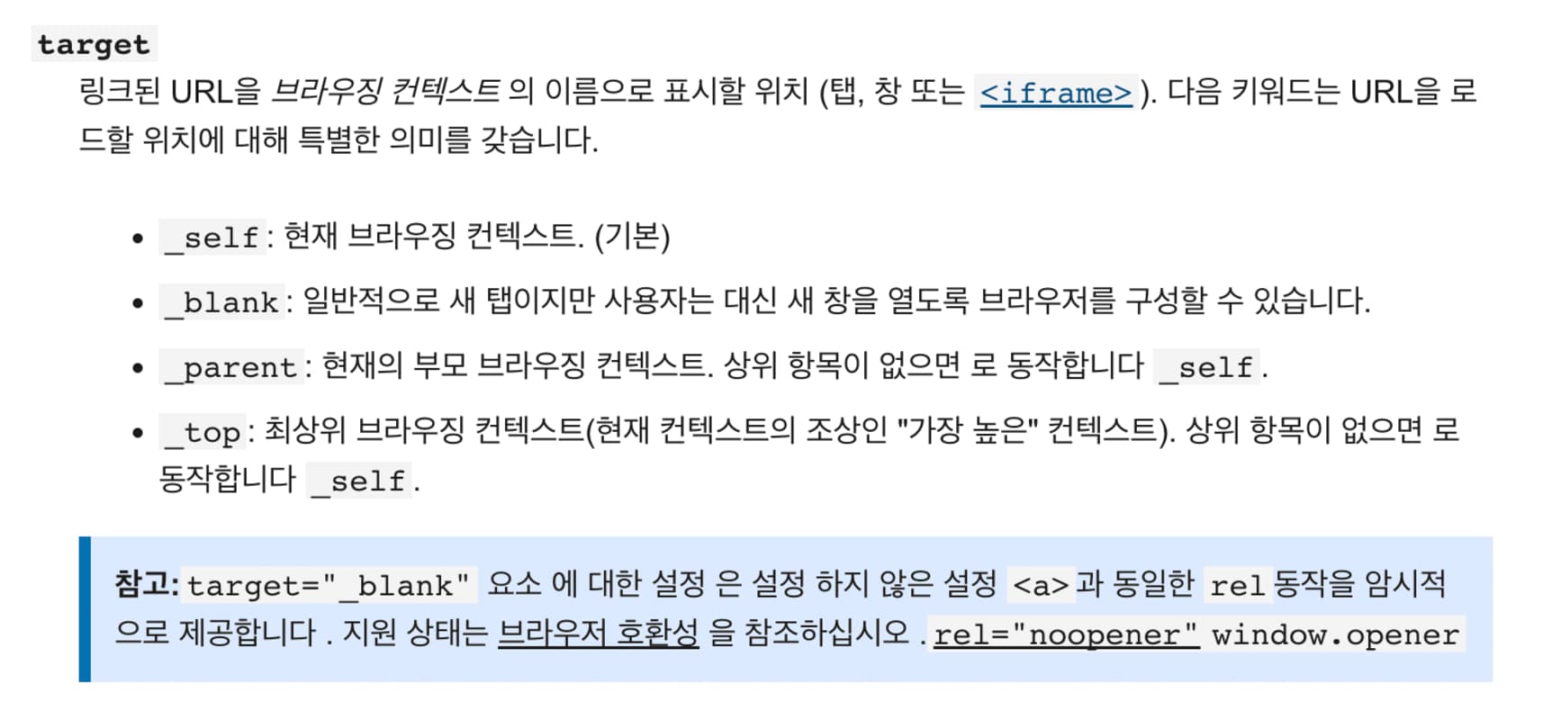 - blank는 기본속성은 아니지만, 브라우저의 새 탭으로 연결됩니다.